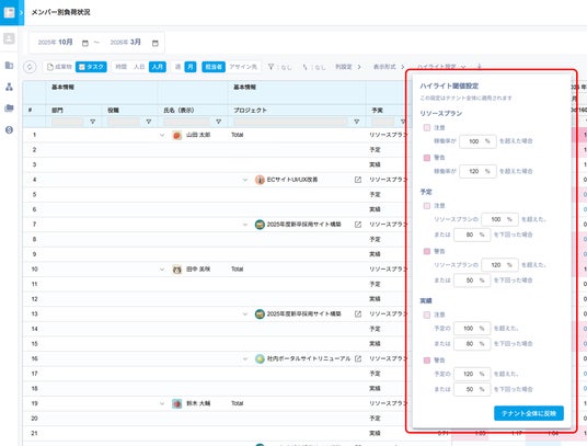 ・計画段階でのリスク予防:リソースプラン段階で、合計が100%を超えるメンバーの早期発見が可能