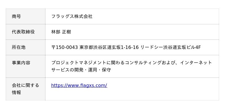 「テクノロジーを通じたイノベーションで社会と人々の働き方をもっと幸せにする」をミッションに、プロジェクト/事業の生産性向上を支援するクラウド型プロジェクトマネジメントDX プラットフォーム「Flagxs(フラッグス)」を展開。