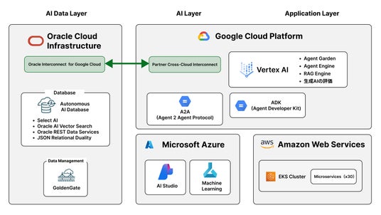多くの企業で使われているOracle AI Databaseをデータ基盤として使用することで、既存のお客様のビジネス・データをAIエージェントから使用でき、効果を迅速に得られます。また、文書や画像などあらゆるデータをAIから扱える、最新のデータベース技術と、マルチクラウド機能により、複数クラウドに跨ったあらゆるデータをシームレスにAIエージェントで活用できます。