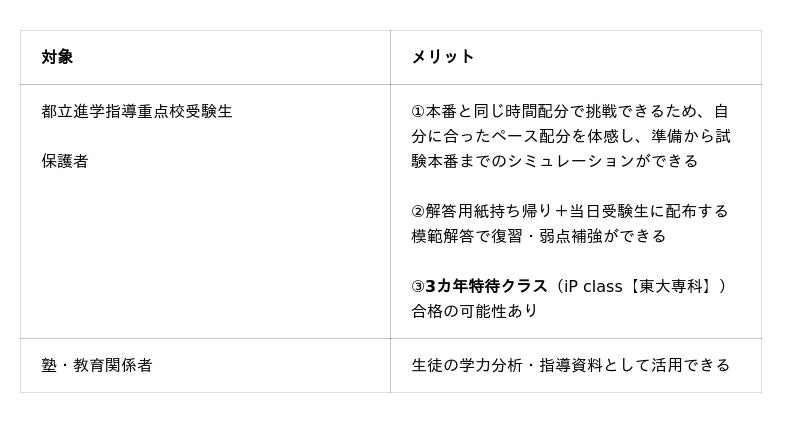 本入試は、都立日比谷・戸山・青山高等学校などの都立進学指導重点校を中心とした10校が実施する自校作成問題に準じた形式・難易度で構成されています。都立入試本番と同様のスケジュールで行われる実戦的な試験として、受験生には都立受験本番前の最終確認、保護者や塾関係者の方には生徒の苦手を再確認し、最終調整できる機会となっています。