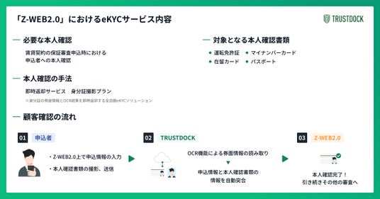 株式会社TRUSTDOCK(東京都中央区、代表取締役:千葉 孝浩、以下「TRUSTDOCK」)は、全保連株式会社(本社:沖縄県那覇市、代表取締役 社長執行役員:茨木 英彦、以下「全保連」)が展開する不動産会社向け電子申込システム「Z-WEB2.0」に、eKYC(オンライン本人確認)サービス「TRUSTDOCK」の提供を開始しました。