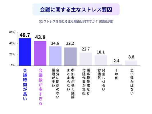 会議に関する主なストレス要因について尋ねた質問では、「会議時間が長い」(48.7%)、「会議数が多すぎる」(43.8%)が上位を占めていることから、会議の負担軽減や効率化への強い期待が示された結果といえます。