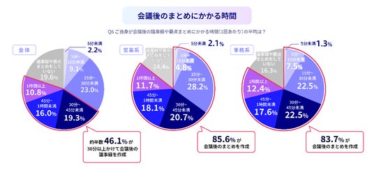 また、会議後に議事録作成を行っている人は80.4%に上り、さらに全体のうち46.1%が30分以上を費やしていることから、多くのビジネスパーソンが会議および議事録作成に多くの業務時間を充てている実態が明らかになりました。役割別にみると、営業系(85.6%)、事務系(83.7%)などにおいて、会議後のまとめをしている割合が特に高くなっています。