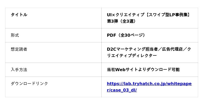 株式会社ベクトル(本社:東京都港区、代表取締役会長兼社長 CEO:西江 肇司、東証プライム:6058)の子会社で、SaaS事業及びデジタルマーケティング支援事業を展開する株式会社トライハッチ(東京都新宿区、代表取締役社長、武藤 尭行、以下「当社」)は、スワイプ型LPの活用ノウハウをまとめた資料シリーズの第3弾として、没入型UIとストーリーテリングに特化した『スワイプ型LP事例集 Vol.3(クリエイティブ編)』を公開いたしました。