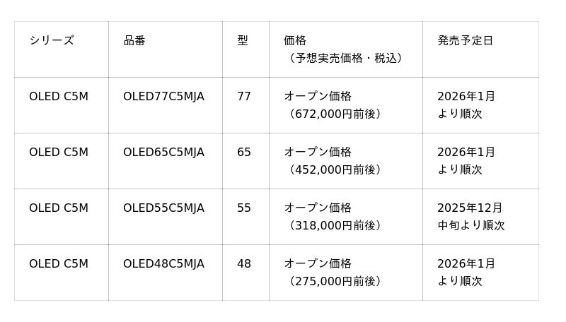 LGエレクトロニクス・ジャパン株式会社(代表取締役:孫 成周(ソン・ソンジュウ)、本社:東京都中央区)は、4K有機ELテレビ「OLED C5M」シリーズを、販路限定モデルとして2025年12月中旬より順次発売します。