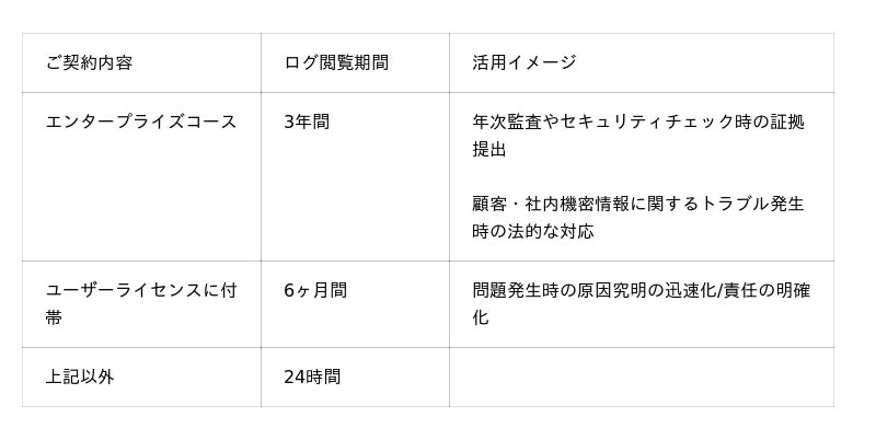 内部統制や監査対応が必要な企業様には、3年間のログ保存が可能な「エンタープライズコース」を推奨いたします。