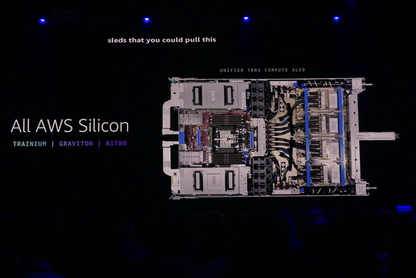 今回は前世代の5倍のL3キャッシュを搭載した「Graviton5」を新たに発表し、EC2で最高の価格性能比を実現した。また、AIに関してもTrainiumチップを強化し、コスト性能比の高いワークロードを実現。同じサーバーボード上にTrainium、Graviton、NitroというAWSのカスタムチップを搭載し、高いコスト効果を実現しているという。