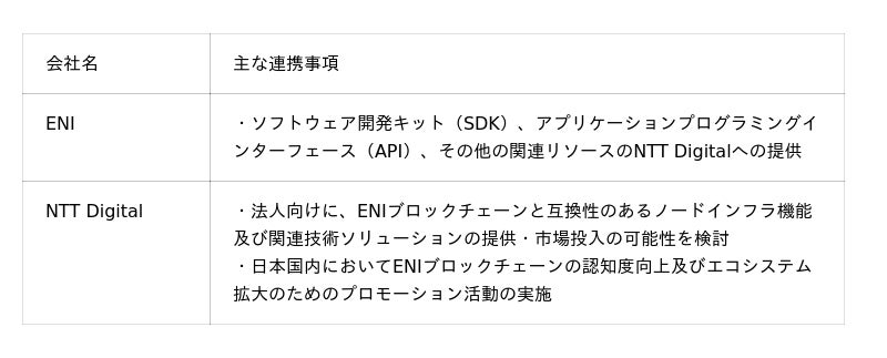 ENIとの協業は、エンタープライズグレードの高性能ブロックチェーン「ENIブロックチェーン」の技術の日本市場への社会実装および普及促進を目指し、国内企業のweb3活用を加速させ、社会全体のデジタルインフラ強化を図ることを目的としています。