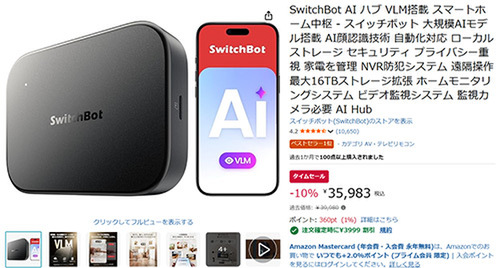 SwitchBot(スイッチボット)の次世代スマートホームを支える中枢デバイス「SwitchBot AIハブ」が、Amazonタイムセールに登場しました。過去価格39,980円のところ、10%オフの35,983円となっています(さらに注文確定時に3,999円割引のプロモーション情報あり)。