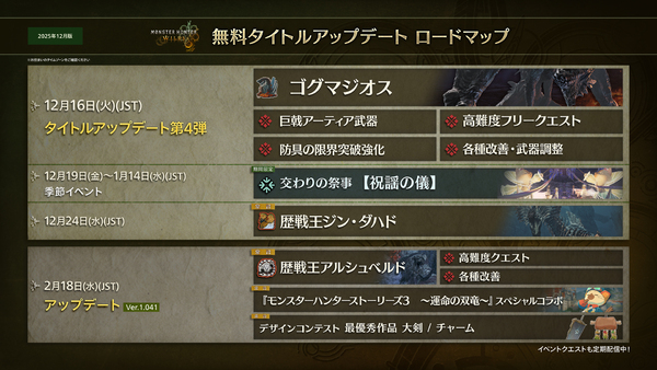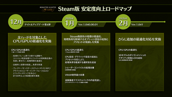 これまで遊んできたユーザーへ感謝の気持ちを述べつつ、2026年2月には歴戦王アルシュベルドの実装、「オリジナル武器・チャームデザインコンテスト」の最優秀作品の実装、Steam版の安定度向上に関するアップデートを予定していると語った。
