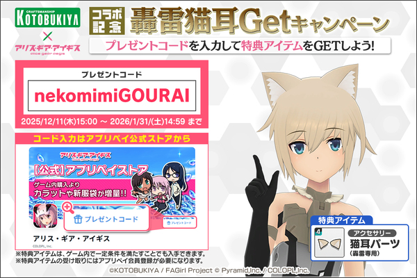 そして開催期間中、開催店舗で『アリス・ギア・アイギス』関連商品または「コトブキヤ」製商品を1点以上購入すると、ゲーム内アイテム「荷電式超大型戦術刀「猩血」を再現したクロスギア×4属性分」と交換できるプレゼントコード付きポストカードをプレゼント。開催期間は、2026年1月31日まで。
