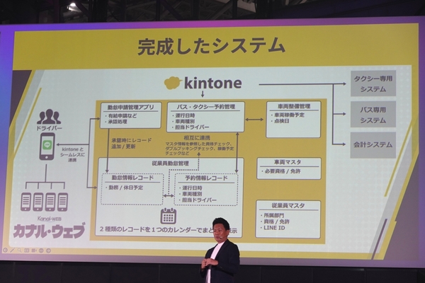 開発期間は約1年に及んだ。完成したシステムでは、ドライバーは使い慣れたLINE(ビットリバー開発のカナル・ウェブで連携)から毎月の希望勤務を申請し、そのデータはkintoneに自動登録される。この「勤怠情報」を、車検や点検情報を含む「車両情報」、そして「案件情報」と連動させる仕組みを作り上げた。高齢のドライバーが多いことから、LINEの画面は文字を大きくし、自身の抱える仕事も確認できるように工夫している。