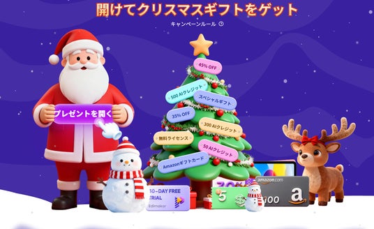 本キャンペーンでは、Edimakor動画編集ソフトの永久プラン・年間プランをはじめ、AIフェイススワップやAIクリスマス画像生成などに利用できるAIクレジットも最大60%OFFで販売。また、永久版購入者限定の「録画ソフト無料プレゼント」や、必ず何か当たるギフト抽選など、幅広いユーザーに向けた特典を多数用意しています。