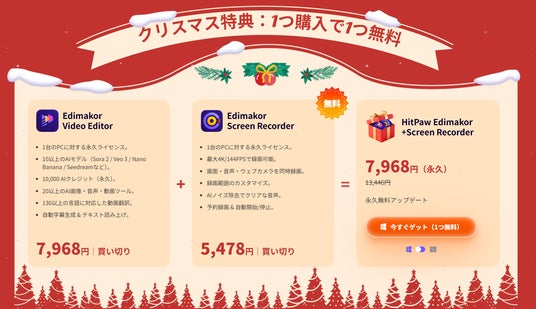 今年のクリスマスシーズン、動画制作の初心者でも手軽にAI編集を楽しめる「HitPaw Edimakor」が、年間最大規模のホリデーセールを実施します。