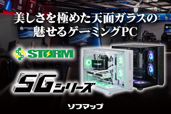 ソフマップは、12月13日からアイティーシー製のゲーミングデスクトップPC「STORM」の新製品「SGシリーズ」をソフマップ対象店舗およびインターネット通販サイト「ソフマップ・ドットコム」にて販売開始する。価格はプレミアムモデルが419,800円から、スタンダードモデルが199,800円からとなる。