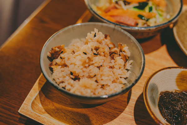 +110円で変更した沖縄風炊き込みご飯のジューシー。豚肉やカツオ・豚骨の出汁、椎茸などと一緒に炊き込むため深い旨味と豊かな風味が特徴です。ほんのり茶色いご飯は出汁の甘みが効いていてコク深く、主役級の美味しさ。これは間違いなく、プラス料金を払ってでも選ぶ価値あり!