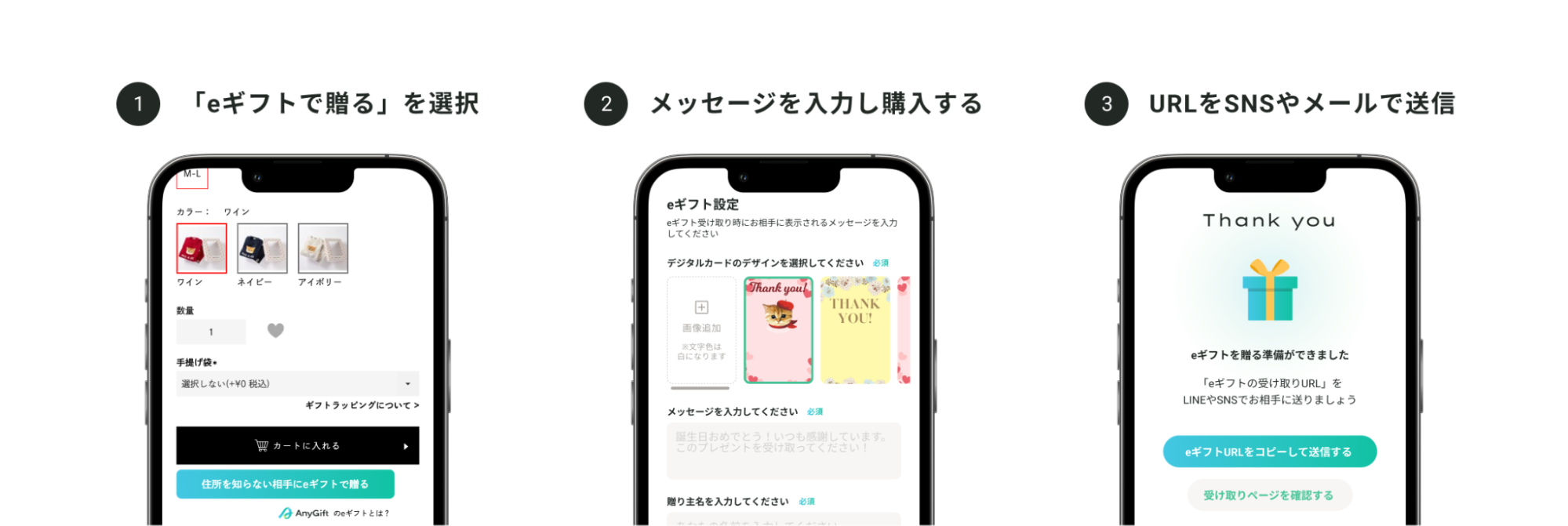 AnyGiftは、相手の住所を知らなくてもLINEやメールで贈ることができる「eギフト機能」を、ECサイトに組み込むことができるサービスです。