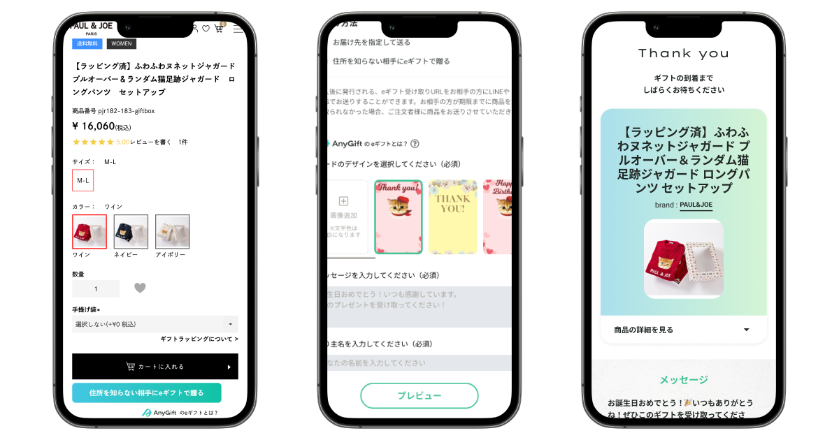 そこでこの度、お客様にもっと気軽にPAUL & JOEルームウェア公式サイトの商品をプレゼントとしてご利用いただきたいという思いから、AnyGiftの導入を決定いたしました。