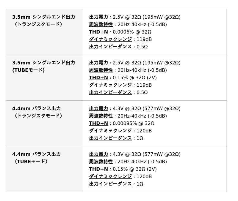 3.5mm+4.4mmデュアルインターフェース 最大577mW@32Ω