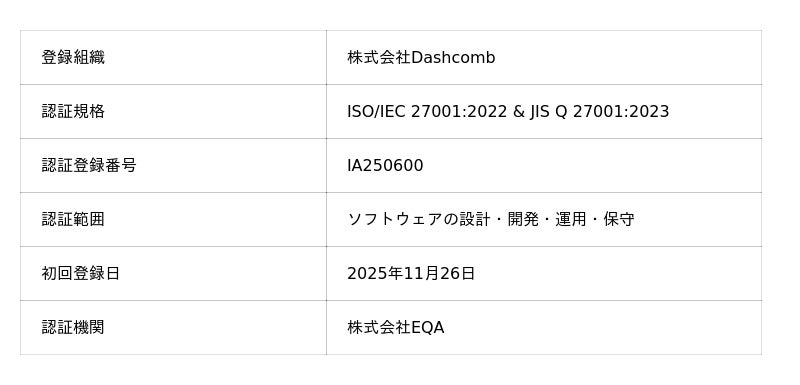 株式会社Dashcomb(本社:東京都渋谷区、代表取締役:小野邦智、以下「当社」)は、情報セキュリティマネジメントシステム(ISMS)の国際規格である「ISO/IEC 27001:2022」ならびに国内規格「JIS Q 27001:2023」の認証を2025年11月26日付で取得しました。