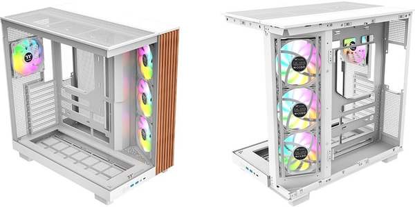 Thermaltakeは、新しい「Viewシリーズ」において、美しい木製のラインを含むピラーレスデザインを採用。フロントと左サイドに強化ガラスパネルを備えており、どの角度からでも内部のライティングが楽しめるとしている。アドレサブルRGBファンを標準装備しており、ASUSやGIGABYTEなど各社のマザーボードからライティングのコントロールが可能となっている。