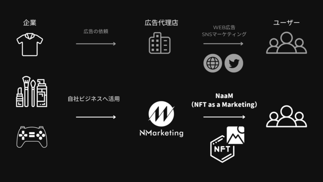 NFT・Web3特化の広告代理店であるNMarketingは、累計10社以上のNFT事業を支援してきた実績を基に、NaaM(NFT as a Marketing)事業を中心に、企業のNFT活用を支援しております。