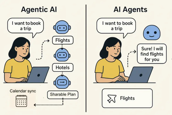 以下の画像では、旅行の予約というシナリオにおけるエージェンティックAI とAIエージェントの挙動の違いが示されています。画像左側のエージェンティックAIでは複数のAIエージェントが「旅行の予約」という目的達成のための段階的にサブタスクを実行しています。