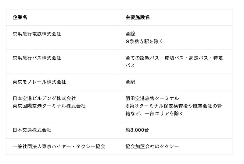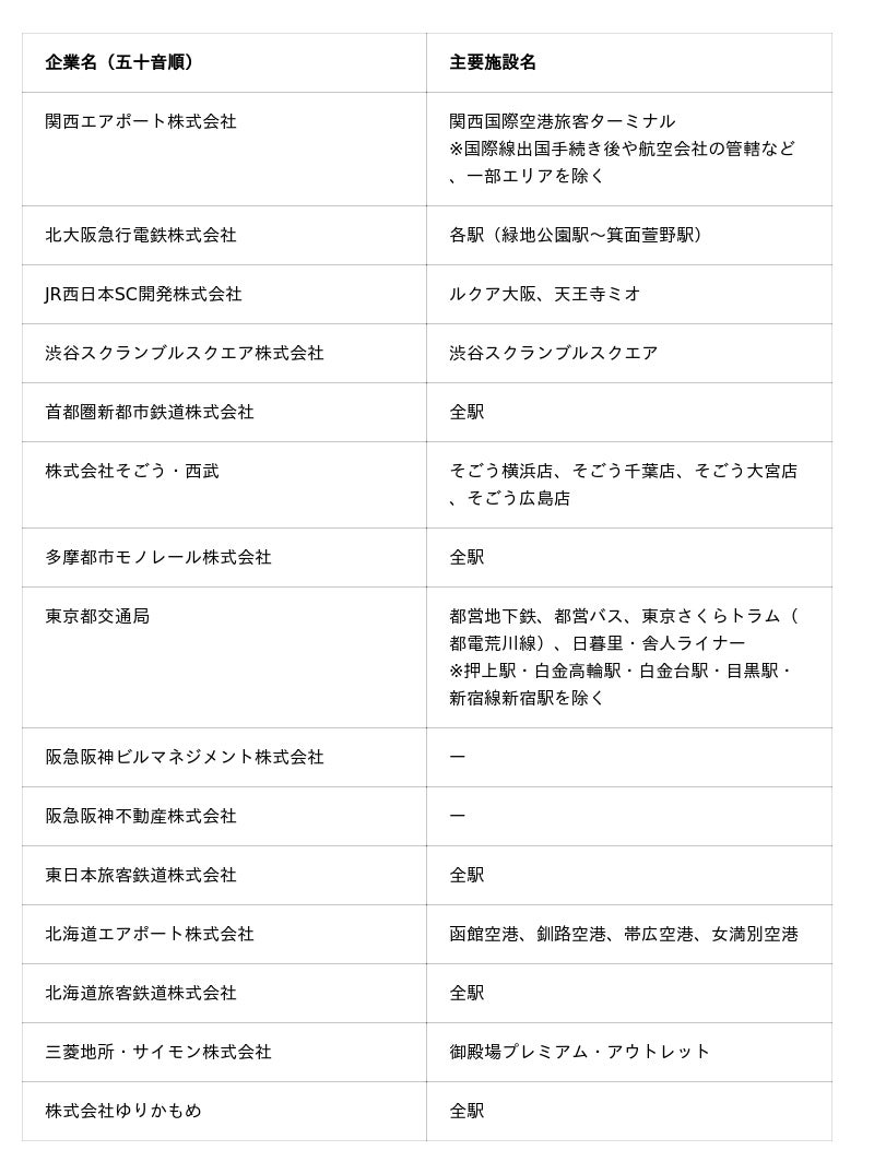 本サービスは、以下の6社の企業・団体との連携からスタートします。今後、全国の主要交通・商業施設への拡大を予定しています。