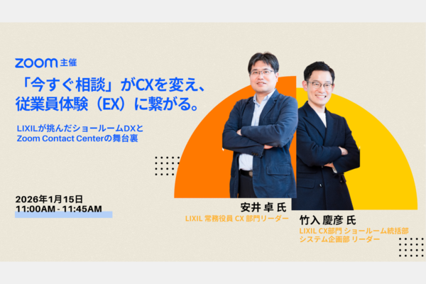Zoomが2026年1月15日に開催するウェビナーでは、LIXIL 常務役員 CX 部門 リーダーの安井卓氏、同社 CX部門 ショールーム統括部 システム企画部 リーダーの竹入慶彦氏を迎え、CXだけでなくEX(従業員体験)も同時に改善した、この取り組みの舞台裏が紹介される。