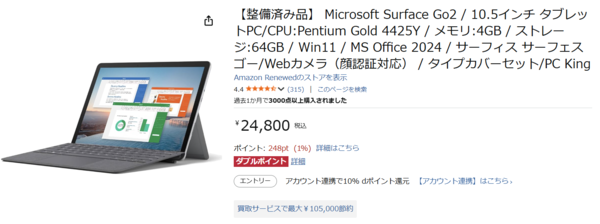 Amazonブラックフライデーのセールでは21,080円という驚きのお得価格でしたが、セールが終了した現在の販売価格は24,800円。セール時よりは高いですが、純正タイプカバー、Microsoft Office 2024が付いてこの価格はお得ではないでしょうか!持ち運び前提の“軽めのWindows端末”を探している人も多いはず。今回紹介するのは、10.5型のSurface Go 2整備済みセット。キーボード(タイプカバー)付きで、外出先の文書作成や簡単な作業に寄せた構成なので、「サブ機が欲しい」「家のPCはあるけどもう1台ほしい」という用途に刺さりやすい。