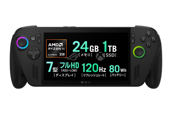 ディスプレーは、最大輝度500nitsの7型フルHD(120Hz)を搭載。CPUには、グラフィック性能が高く、電力効率にも優れる高速なAMD Ryzen AI Z2 Extremeを採用するほか、24GBメモリー、1TBストレージ、NPUの搭載などスペックも上々だ。優れたホールド感、約13.9時間駆動(動画再生時)のバッテリー、安心の冷却性能などで至高のゲーム体験を提供する。
