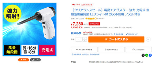 充電式で繰り返し使える電動エアダスター。無段階風量調整とLEDライト搭載で、細かな場所の清掃も手軽に行えます。