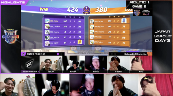 終盤に出現するグラードンこそDetonation FocusMeが倒したものの、お互いに最後まで激しく攻め続けた結果、ENTER FORCE.36が僅差で勝利しストレート勝ちとなりました。
