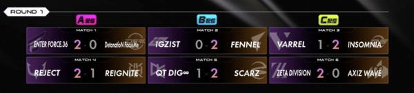 なおROUND 1の試合結果ですが、FENNELが2-0でIGZISTに勝利、INSOMNIAが2-0でVARRELに勝利、REJECTが2-1でREIGNITEに勝利、SCARZが2-0でQT DIG∞に勝利、ZETA DIVISONが2-0でAXIZ WAVEに勝利となっています。