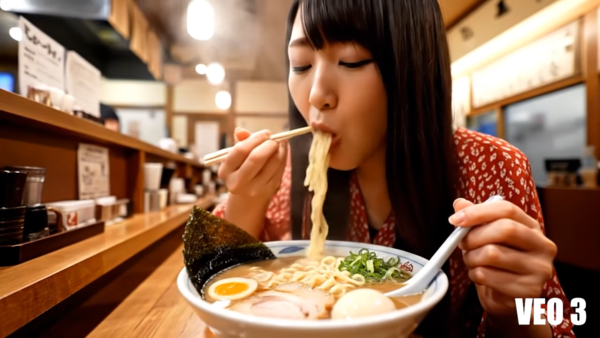 その後、2025年3月にグーグル「Veo 2」、さらに6月には「Veo 3」が発表されて、その水準に驚かされました。2024年12月にリリースされたOpenAIの「Sora」の品質が期待外れであったこともあり、評価を集めました。ラーメンを食べるといった表現は、人物と対象物とが複雑に重なり合うような構図でさえも、自然に生成できるようになりました。ただし、当初は柔軟性が低かったことと、値段の高さがネックになりました。