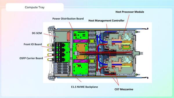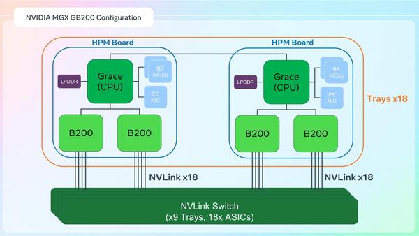 NVIDIAが提供するBlackwell Superchipをそのまま使うのではなく、独自の(それがMeta謹製なのか、NVIDIAにカスタムで製造を依頼したのか、それともサードパーティ製造のものなのかは不明)B200とGraceが1つずつ搭載されたボード(HPMボード)を使い、これを2枚で1つのCompute Trayに収めている。