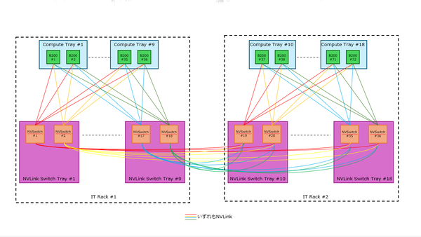 ラックあたりのCompute Tray数は18と変わらないので、1ラックあたり36個のGB200とGraceが実装されているわけだ。そのラックを2本並べ、NVLink Switchそのものを相互接続する形で構成している。これをもう少し細かく書いたのが下図である。