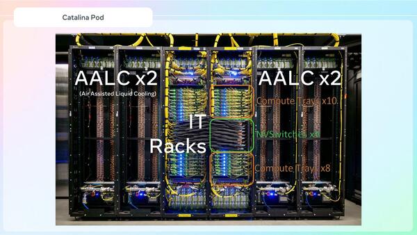 MetaのCatalinaは、本来なら専用データセンター設計が必要なところを、普通のデータセンターで使えるように工夫した成果と見ることもできよう。ではこの先ラックはどうなって行くのか? という話を次回説明したい。