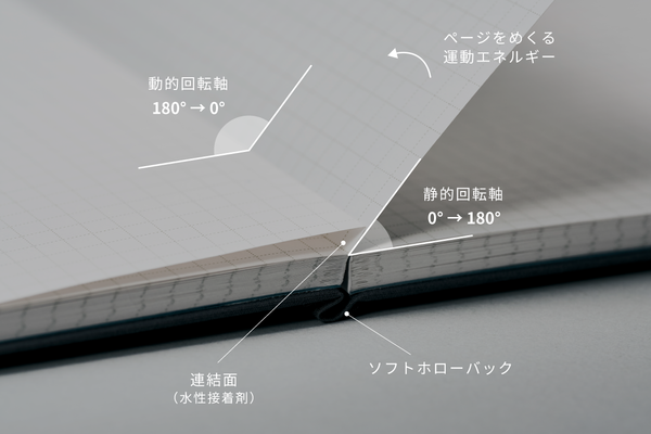 特徴は、一枚の紙のようにひらけるフラットな見開き性。ページを綴じているノート中央部分の段差を意識せずに見開き全体を一枚の紙のように広げられるとともにページのバウンドを抑え、安定した筆記を可能にし、全体を俯瞰しやすくしたとのこと。サイズは、PCやタブレットに近い見開き13インチ。向きを気にせず使えるデザインで、自由な筆記と思考の連続性を両立するとしている。
