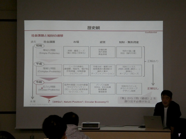 同時に小林氏が指摘したのは、昭和・平成・令和と時代が進む中で、企業や組織が取り組むべきものはより複雑になってきているということだ。昭和の時代は、社会全体が比較的シンプルな課題構造を持っていた。市場は拡大局面にあり、「どう規模を拡大するか」「どれだけ多くの量を作れるか」「どうすれば効率的なオペレーションになるか」など、比較的わかりやすい課題を解決すればよかった。つまり、一定の品質を満たした製品を、安く大量に供給することができれば、事業として成立し、誰もが豊かになれる時代だった。そこでは工場や設備といった有形資産が競争力の中心であり、知財が技術を守るための道具として機能し、それを補完する存在であったという。
