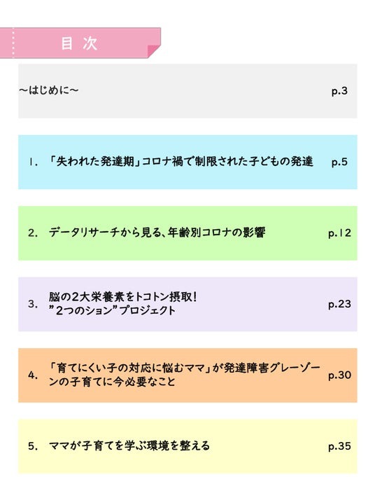 子どもの成長にはタイミングがあります。失われた発達の機会を取り戻すためにも、保護者が今日からできる一歩をまとめた本小冊子が、その手助けとなれば幸いです。