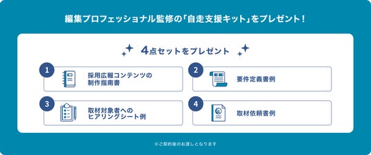 「StoryHub for 採用広報」をご契約者の方限定で、編集プロフェッショナル監修の「自走支援キット」(「採用広報コンテンツの制作指南書」「要件定義書例」「取材対象者へのヒアリングシート例」「取材依頼書例」)をプレゼント。取材依頼から記事の制作までの内製化をサポートします。