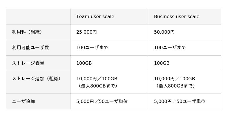2つの新プランは、「ユーザ数は多いが、一人あたりのデータ利用量が少ない企業」または「ユーザIDの追加・削除が頻繁な企業」などで特に大きなメリットとなります。なお、利用可能な機能は、既存プランの「Team」および「Business」と同様となります。