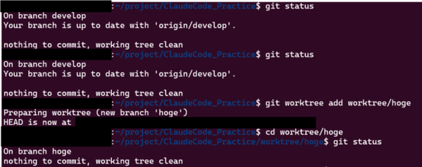 以下の画像は、実際ターミナル上でworktreeを用いてbranch作成をしているものです。