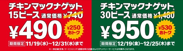 マクドナルドは12月19日~25日までの期間「チキンマックナゲット30ピース(ソース6個付き)」を特別価格950円で販売します。