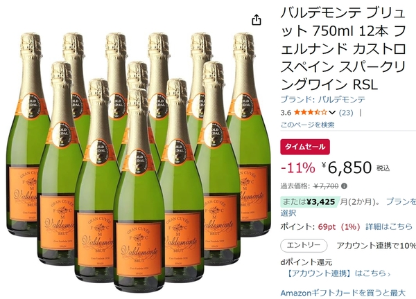 バルデモンテ ブリュットの12本セットが、現在開催中のAmazonタイムセールで11%割引となっています。