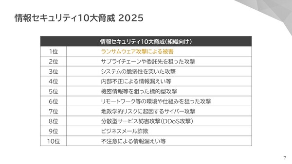 2025年1月末にIPAから発表された「情報セキュリティ10大脅威2025」では、ランサムウェア攻撃による被害が1位となった。10年連続10回目の選出である。いまや、いつ、どの企業が標的にされてもおかしくはない。すなわち、ランサムウェアへの対策を怠ってはならないのだ。