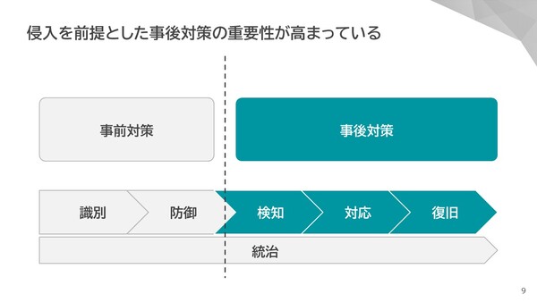 こうした被害の大きさを考慮すると、攻撃を受ける前、あるいは攻撃を受けたとしても被害が発生する前に対策を講じることが重要である。特に、「侵入を前提とした事後対策」の重要性が高まっている。