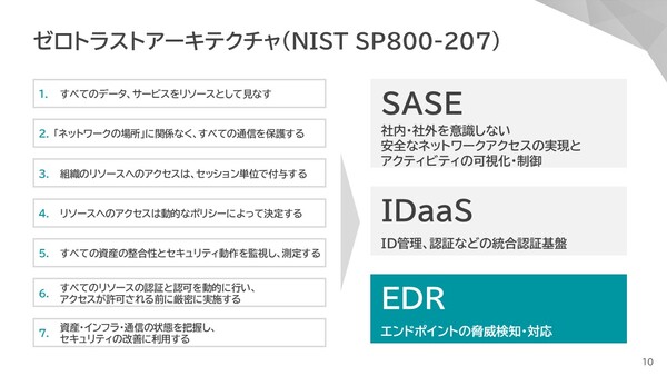 これらゼロトラストの原則を実現するソリューションとしてEDR(Endpoint Detection and Response)、IDaaS(Identity as a Service)、SASE(Secure Access Service Edge)が知られている。この中から、次章以降、EDRについて解説する(図3)。