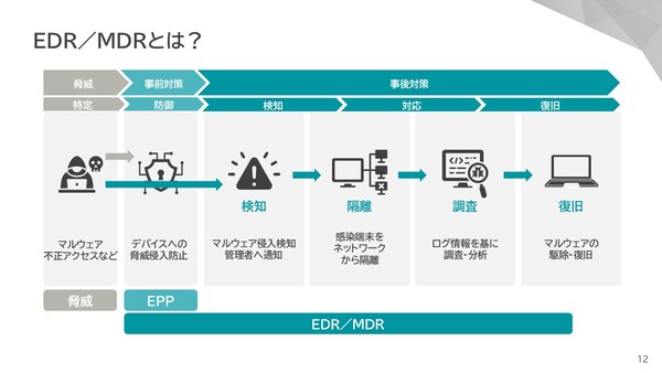 EDRとは、パソコンやサーバーなどのエンドポイントにおける不審な挙動を検知し、迅速な対応を支援するソリューションである。事後対策には検知、隔離、調査、復旧が含まれ、それぞれの場面でEDRが活用される。例えば、不審な挙動を検知した場合には管理者へ通知が送られる。そのほかにも、不審な端末やマルウェアに感染した端末をネットワークから隔離したり、ログ情報をもとに調査や分析を支援したりする機能が提供される。さらに、マルウェアの削除やエンドポイントの復旧支援も可能である。ただし、あくまで、これらの作業を支援する製品であるため、実際に効果を発揮するには適切な運用体制の整備が必要となる。一方、MDR(Managed Detection and Response)は、EDRの運用や管理を代行するセキュリティサービスである(図4)。